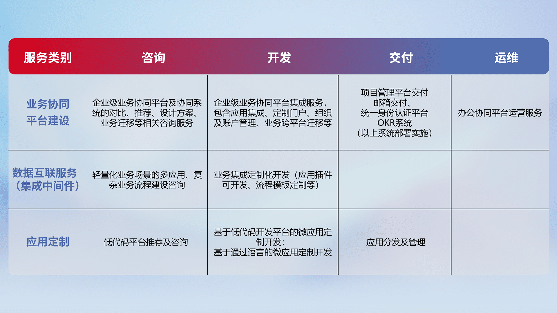 针对钉钉、、企微、、、IDaas等平台级产品提供产品的规划、、、方案、、、交付、、、定制化开发等服务,,,实现如统一协同办公、、智能客户服务、、、混合会议管理、、智能数据查询、、等业务场景,,,,实现数字化转型。。。