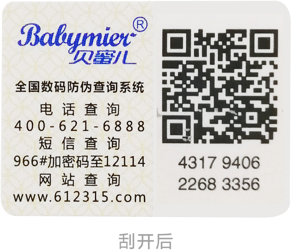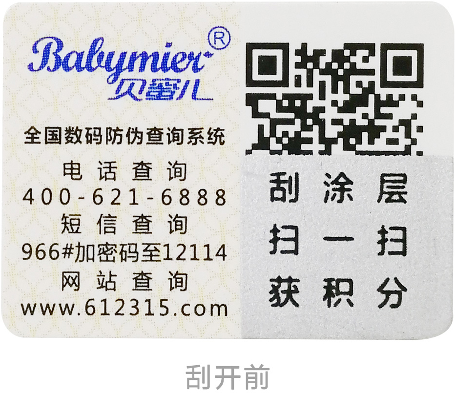 产品包装上,,,贴有一个如下图的防伪获积分标签,,,,刮开银灰色涂层,,,,可见二维码和防伪数码。。。
